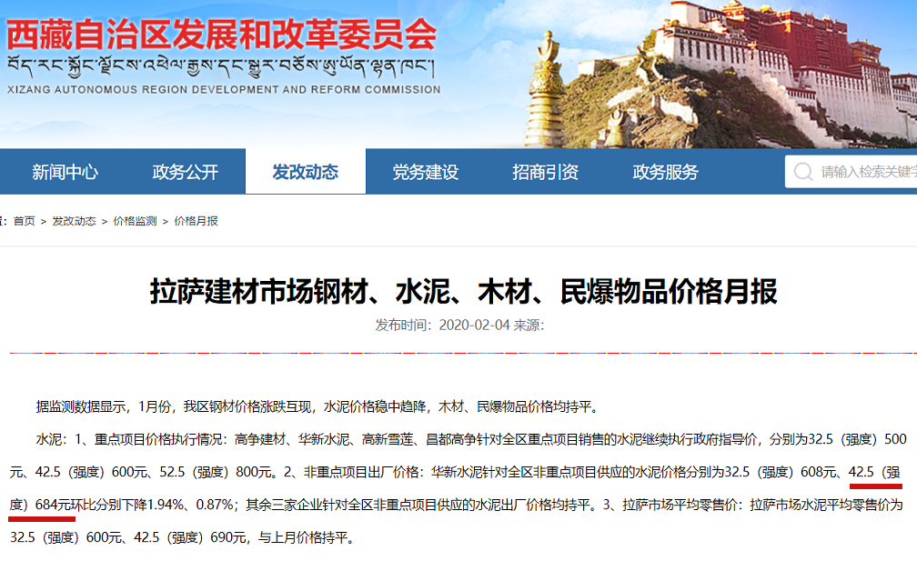 水泥內(nèi)參數(shù)據(jù)顯示,2020年1月西藏水泥價格約690元/噸,2年時間里跌去350元/噸。西藏地區(qū)水泥價格之高曾引領(lǐng)全國,在水泥零售市場甚至動輒超過1000元/噸的高價。