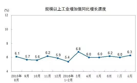 2016年8月份,規(guī)模以上工業(yè)增加值同比實(shí)際增長(zhǎng)6.3%(以下增加值增速均為扣除價(jià)格因素的實(shí)際增長(zhǎng)率),較7月份加快0.3個(gè)百分點(diǎn)。從環(huán)比看,8月份,規(guī)模以上工業(yè)增加值增長(zhǎng)0.53%,比上月加快0.01個(gè)百分點(diǎn)。1-8月份,規(guī)模以上工業(yè)增加值同比增長(zhǎng)6.0%。