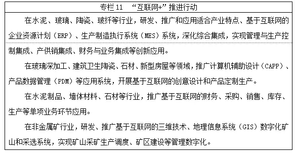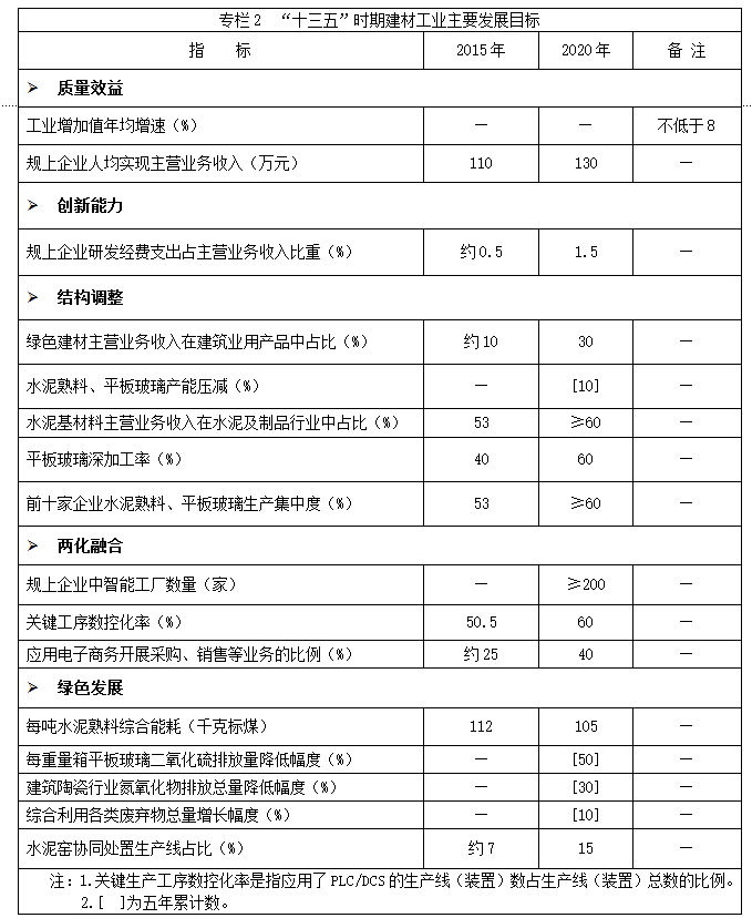 “要加快建材工業(yè)由生產(chǎn)型制造向服務(wù)型制造轉(zhuǎn)變?!惫ば挪恳?guī)劃司相關(guān)負(fù)責(zé)人表示,要發(fā)展建材工業(yè)研發(fā)設(shè)計(jì)、創(chuàng)業(yè)孵化等服務(wù)業(yè),推進(jìn)設(shè)備維修專(zhuān)業(yè)化服務(wù),發(fā)展壯大面向建材工業(yè)的生產(chǎn)性服務(wù)業(yè)。推進(jìn)建材行業(yè)電子商務(wù)、專(zhuān)業(yè)物流網(wǎng)絡(luò)配送體系建設(shè)。目前,我國(guó)建材業(yè)信息化水平明顯進(jìn)步。水泥電商比例大幅提高,并建成了玻璃產(chǎn)品現(xiàn)貨和期貨兩大電子商務(wù)平臺(tái)。2015年,建材行業(yè)數(shù)字化研發(fā)設(shè)計(jì)工具普及率47.4%,關(guān)鍵工序數(shù)控化率50.5%?!跋乱徊?,要推進(jìn)數(shù)字化車(chē)間、工業(yè)機(jī)器人、智能傳感器、智能儀器儀表、在線(xiàn)檢測(cè)設(shè)備、固體廢棄物智能化分選裝備、智能化除塵裝備等應(yīng)用,力爭(zhēng)到2020年規(guī)模以上建材企業(yè)中達(dá)到智能制造水平的不少于200家?!惫ば挪恳?guī)劃司相關(guān)負(fù)責(zé)人說(shuō)。《規(guī)劃》還提出了六大重點(diǎn)工程,包括綠色建材生產(chǎn)和應(yīng)用工程、關(guān)鍵材料保障能力提升工程、礦物功能材料發(fā)展工程、協(xié)同處置推廣工程、“三品”行動(dòng)推進(jìn)工程和服務(wù)平臺(tái)建設(shè)工程;提出到2020年,新建建筑中綠色建材應(yīng)用比例達(dá)到40%以上,特色產(chǎn)業(yè)園區(qū)產(chǎn)值達(dá)百億元,水泥熟料原燃料中廢棄物占比達(dá)到20%以上,一批先進(jìn)無(wú)機(jī)非金屬材料實(shí)現(xiàn)產(chǎn)業(yè)化,石墨烯等前沿新材料達(dá)到世界先進(jìn)水平。在關(guān)鍵技術(shù)培育重點(diǎn)上,發(fā)展水泥窯協(xié)同處置技術(shù),專(zhuān)用水泥制備成套技術(shù)與裝備,水泥基復(fù)合材料設(shè)計(jì)及智能制造成套技術(shù)與裝備。在標(biāo)準(zhǔn)上,將制修訂道路等專(zhuān)用水泥標(biāo)準(zhǔn),制修訂混凝土、砂漿、摻合料等產(chǎn)品標(biāo)準(zhǔn)。此外,引導(dǎo)水泥、玻璃、建筑衛(wèi)生陶瓷等行業(yè)骨干企業(yè),從單純提供材料,向提供研發(fā)設(shè)計(jì)、采購(gòu)物流、營(yíng)銷(xiāo)融資、建設(shè)維護(hù)和技術(shù)支持等一體化服務(wù)、系統(tǒng)方案業(yè)務(wù)轉(zhuǎn)變。引導(dǎo)大型建材制造企業(yè)采購(gòu)銷(xiāo)售平臺(tái)向行業(yè)電子商務(wù)平臺(tái)轉(zhuǎn)型,提高企業(yè)供應(yīng)鏈協(xié)同水平,推動(dòng)第三方電子商務(wù)平臺(tái)向網(wǎng)上交易、加工配送、技術(shù)服務(wù)、支付結(jié)算、供應(yīng)鏈金融、大數(shù)據(jù)分析等綜合服務(wù)延伸。發(fā)展網(wǎng)絡(luò)制造新型生產(chǎn)方式,實(shí)現(xiàn)產(chǎn)品研發(fā)、設(shè)計(jì)、制造、銷(xiāo)售、采購(gòu)、管理、維修等生產(chǎn)經(jīng)營(yíng)環(huán)節(jié)的企業(yè)間協(xié)同,形成網(wǎng)絡(luò)化企業(yè)集群。支持利用現(xiàn)有新型干法水泥窯協(xié)同處置生活垃圾、城市污泥、污染土壤和危險(xiǎn)廢物等。研究利用新型墻材隧道窯協(xié)同處置建筑廢棄物、淤泥和污泥等。開(kāi)展赤泥、鉻渣等大宗工業(yè)有害固廢的無(wú)害化處置和綜合利用,開(kāi)展尾礦、粉煤灰、煤矸石、副產(chǎn)石膏、礦渣、電石渣等大宗工業(yè)固廢的綜合利用,發(fā)展基于生活垃圾等固廢的綠色生態(tài)和低碳水泥。在保證產(chǎn)品質(zhì)量和生態(tài)安全的前提下,在水泥、混凝土、墻體材料和機(jī)制砂石等產(chǎn)品中提高消納產(chǎn)業(yè)廢棄物能力,逐步增加可消納固廢的品種?;诮ㄖU棄物生產(chǎn)綠色建材,農(nóng)作物秸稈等農(nóng)林剩余物以及廢舊木制品發(fā)展生物質(zhì)建材。