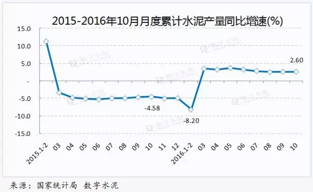1-10月全國水泥產(chǎn)量19.9億噸,同比增長2.6%,增速平穩(wěn)