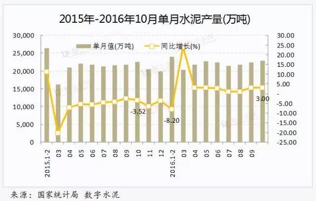 2016年1-10月份,全國規(guī)模以上水泥產(chǎn)量19.9億噸,同比增長2.6%,增速與1-8月份持平。10月份全國單月水泥產(chǎn)量2.3億噸,同比增長3%。10月份市場需求繼續(xù)提升,全國單月水泥產(chǎn)量環(huán)比增長1.74%。