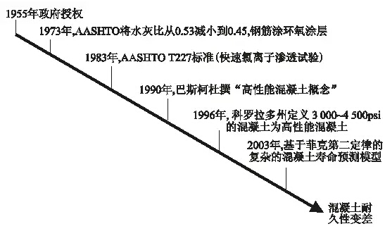 1973年,美國國家公路與運(yùn)輸協(xié)會(AASHTO)把混凝土的最大水灰比從0.53降低到0.45,最低強(qiáng)度從3000psi提高到了4500psi,并開始使用環(huán)氧涂層鋼筋。環(huán)氧涂層鋼筋的黏結(jié)強(qiáng)度下降了35%,導(dǎo)致鋼筋滑移和混凝土開裂加劇。