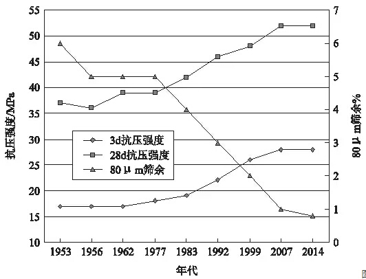 圖8半個(gè)世紀(jì)以來我國水泥強(qiáng)度、細(xì)度變化