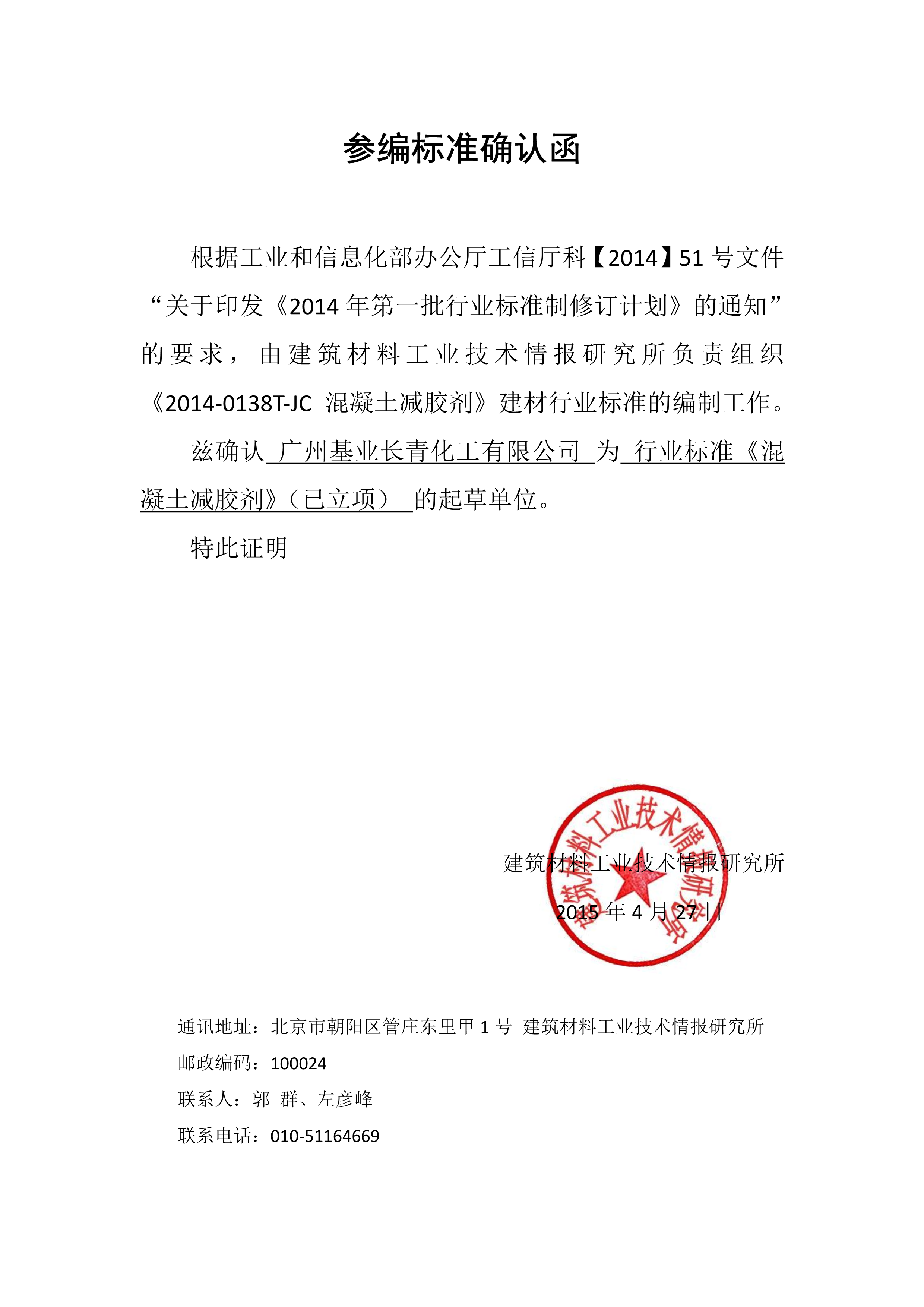 為進(jìn)一步規(guī)范市場行為,促進(jìn)行業(yè)發(fā)展,根據(jù)2014年工業(yè)和信息化部辦公廳《關(guān)于印發(fā)2014年第一批行業(yè)標(biāo)準(zhǔn)制修訂計(jì)劃的通知》文件的要求,由建筑材料工業(yè)技術(shù)情報(bào)研究所負(fù)責(zé)《混凝土減膠劑》行業(yè)標(biāo)準(zhǔn)的編制工作,標(biāo)準(zhǔn)歸口中國建筑材料聯(lián)合會。