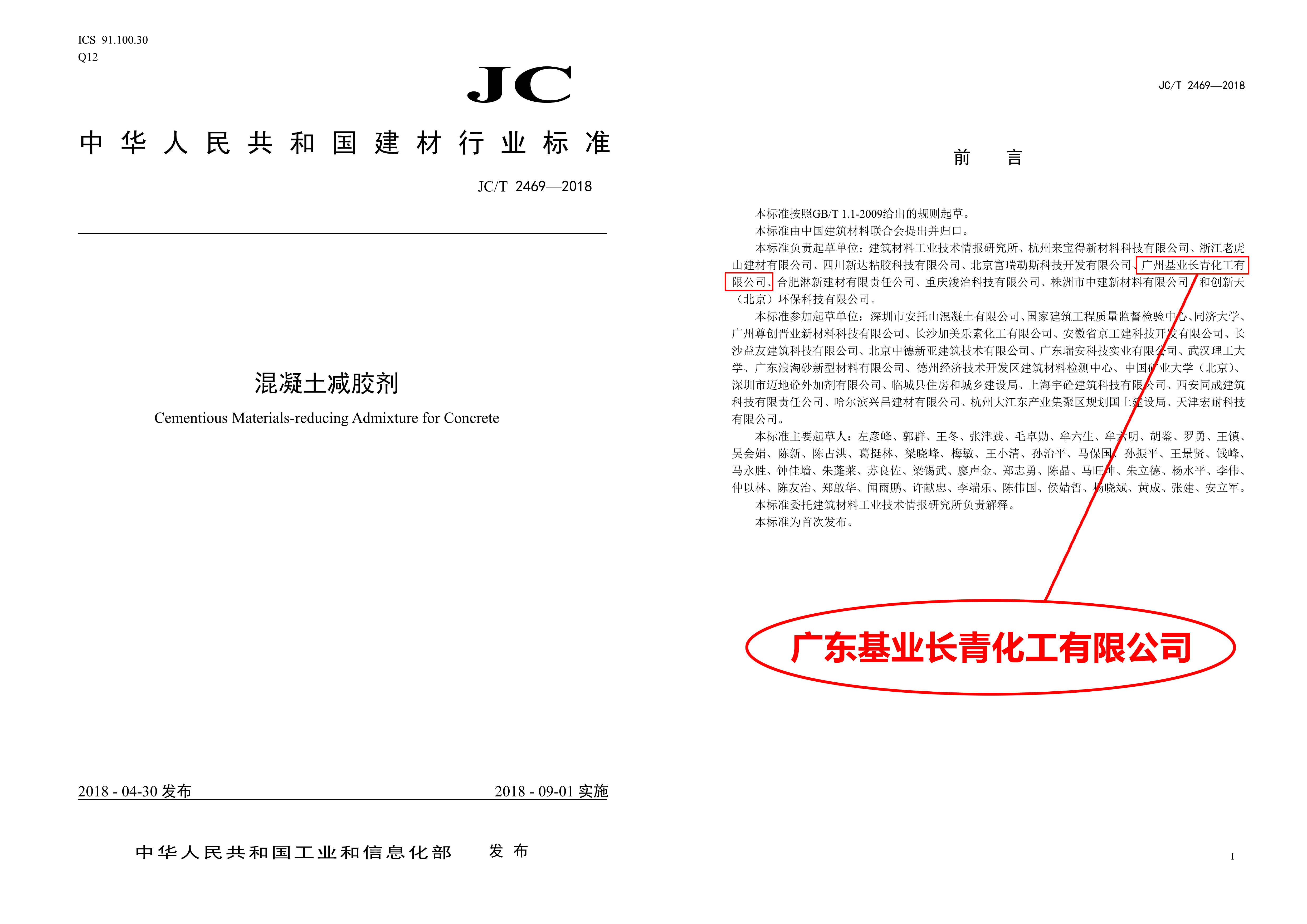 從2015年起,經(jīng)過三年多時(shí)間的反復(fù)研討及審查,建材行業(yè)標(biāo)準(zhǔn)JC/T 2469—2018《混凝土減膠劑》終于在2018年4月30日,正式發(fā)布了。作為標(biāo)準(zhǔn)主要起草單位之一,基業(yè)長青積極履行促進(jìn)行業(yè)標(biāo)準(zhǔn)化的職責(zé),全程參與編寫制訂了混凝土減膠劑的術(shù)語和定義、標(biāo)記、要求、試驗(yàn)方法、檢驗(yàn)規(guī)則以及包裝、貯存等方面的內(nèi)容。
